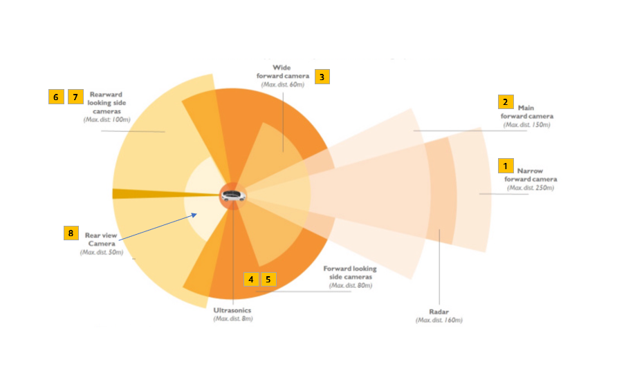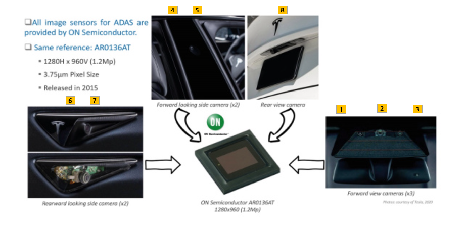 테슬라 모델3, 8개의 카메라 위치